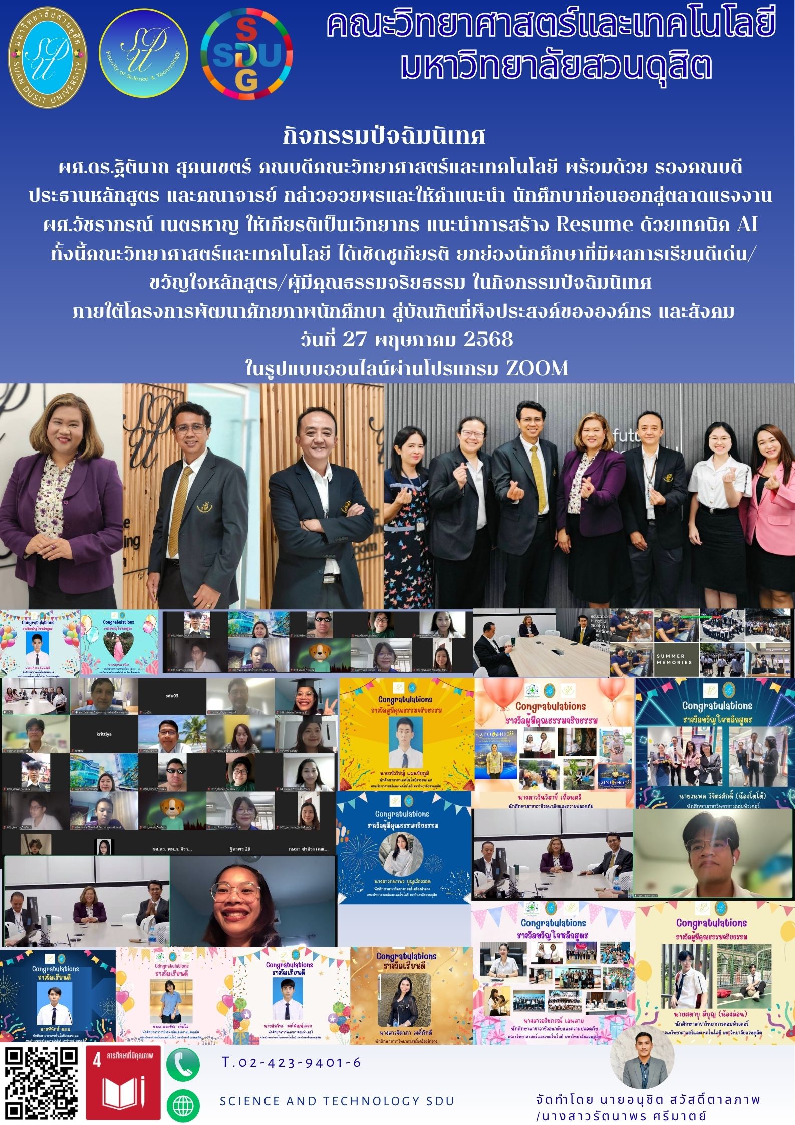 ประธานหลักสูตร และคณาจารย์ กล่าวอวยพรและให้คำแนะนำ นักศึกษาก่อนออกสู่ตลาดแรงงาน ผศ.วัชราภรณ์ เนตรหาญ ให้เกียรติเป็นเวิทยากร แนะนำการสร้าง Resume ด้วยเทคนิค AI ทั้งนี้คณะวิทยาศาสตร์และเทคโนโลยี ได้เชิดชูเกียรติ ยกย่องนักศึกษาที่มีผลการเรียนดีเด่น/ ขวัญใจหลักสูตร/ผู้มีคุณธรรมจริยธรรม ในกิจกรรมปัจฉัมนิเทศ ภายใต้โครงการพัฒนาศักยภาพนักศึกษา สู่บัณฑิตที่พึงประสงค์ขององค์กร และสังคม