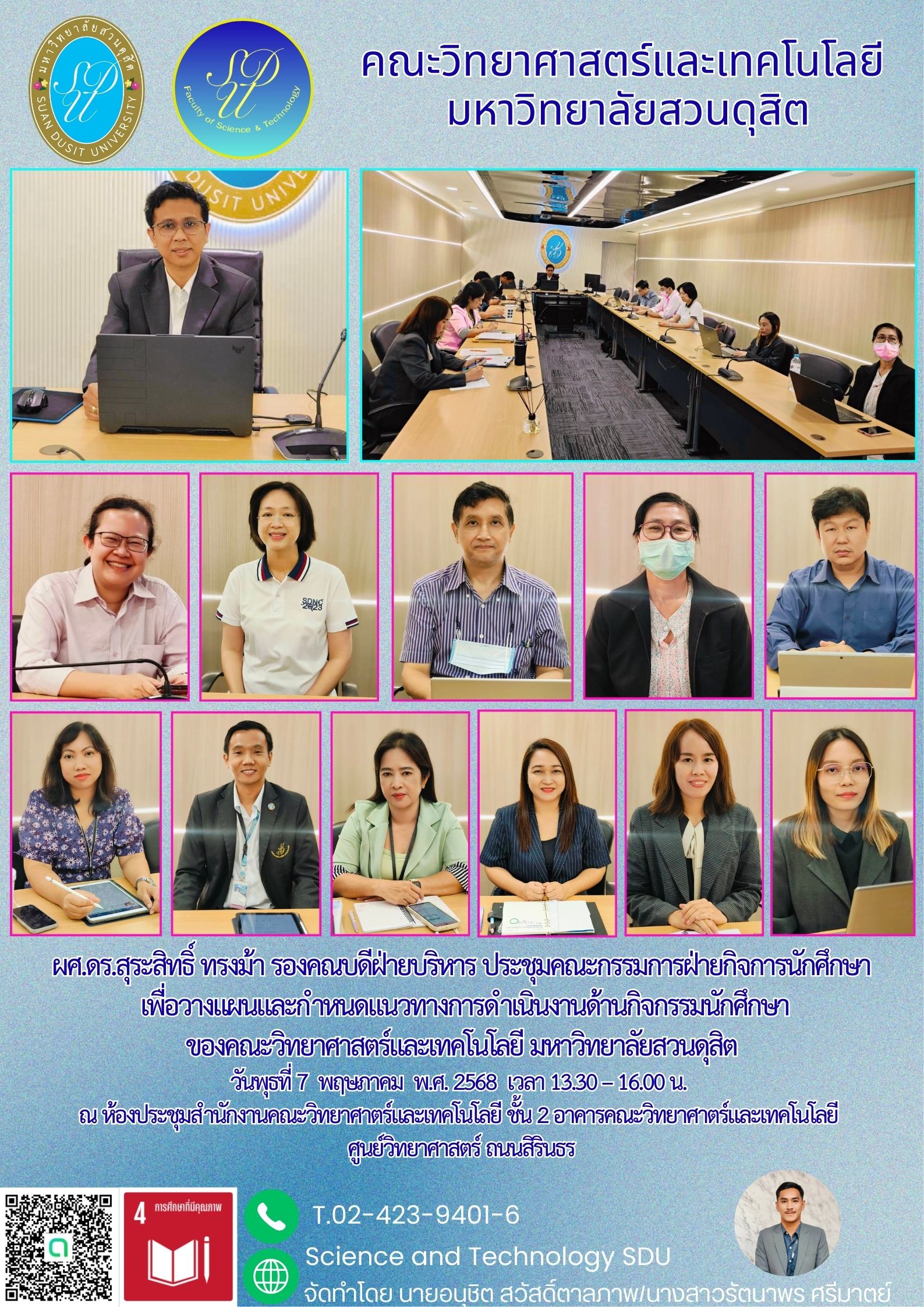 ผศ.ดร.สุระสิทธิ์ ทรงม้า รองคณบดีฝ่ายบริหาร ประชุมคณะกรรมการฝ่ายกิจการนักศึกษา เพื่อวางแผนและกำหนดแนวทางการดำเนินงานด้านกิจกรรมนักศึกษาของคณะวิทยาศาสตร์และเทคโนโลยี มหาวิทยาลัยสวนดุสิต